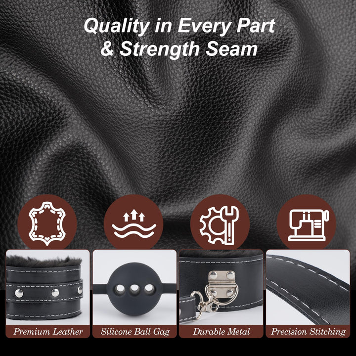 Inkluderar silikon-gag, bojor i konstläder och förstärkt sömnad för säkerhet, komfort och långvarig användning.